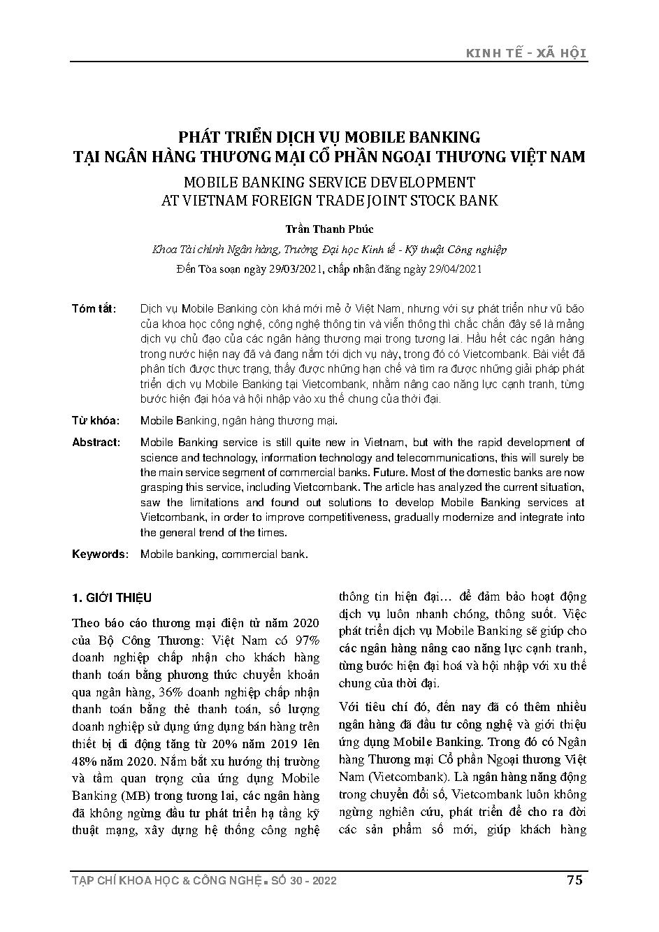 Phát triển dịch vụ mobile banking tại Ngân hàng Thương mại cổ phần Ngoại thương Việt Nam = Mobile banking service development at Vietnam foreign trade joint stock bank