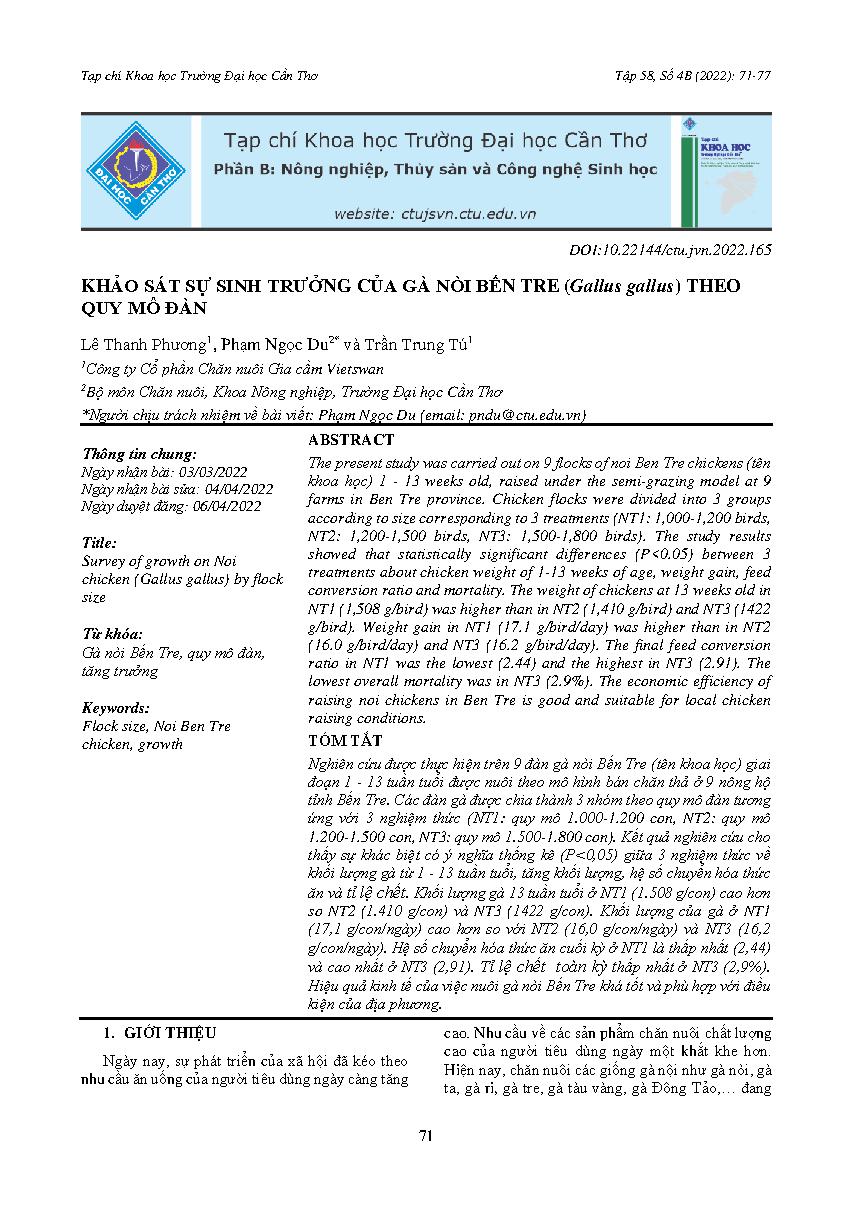 Khảo sát sự sinh trưởng của gà nòi Bến Tre (Gallus gallus) theo quy mô đàn = Survey of growth on Noi chicken (Gallus gallus) by flock size
