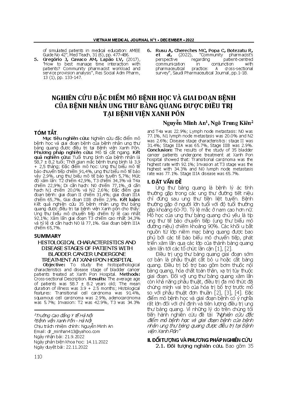 Nghiên cứu đặc điểm mô bệnh học và giai đoạn bệnh của bệnh nhân ung thư bàng quang được điều trị tại Bệnh viện Xanh Pôn = Histological characteristics and disease stages of patients with bladder cancer undergone treatment at Saint Paul hospital