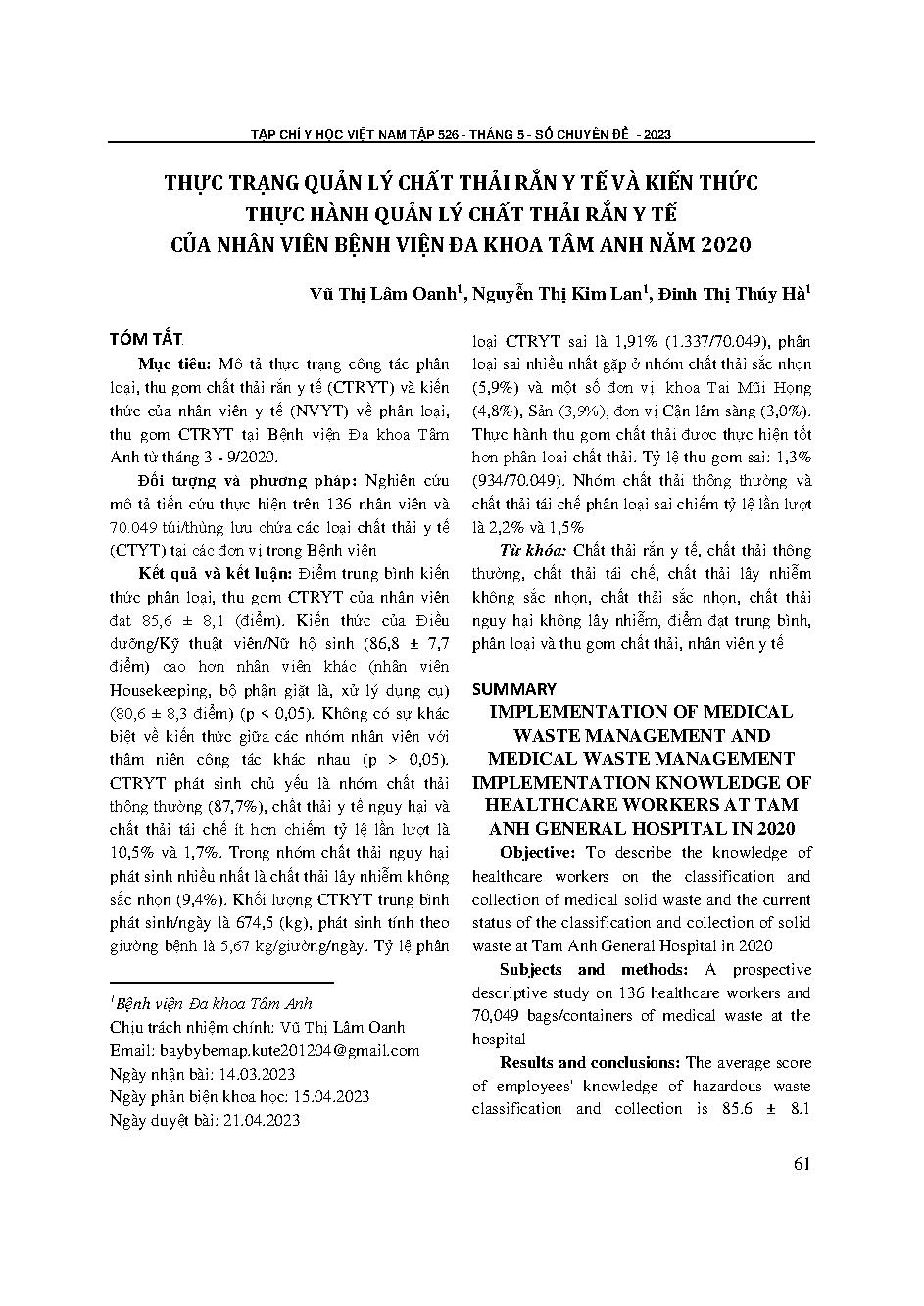 Thực trạng quản lý chất thải rắn y tế và kiến thức thực hành quản lý chất thải rắn y tế của nhân viên bệnh viện đa khoa tâm anh năm 2020