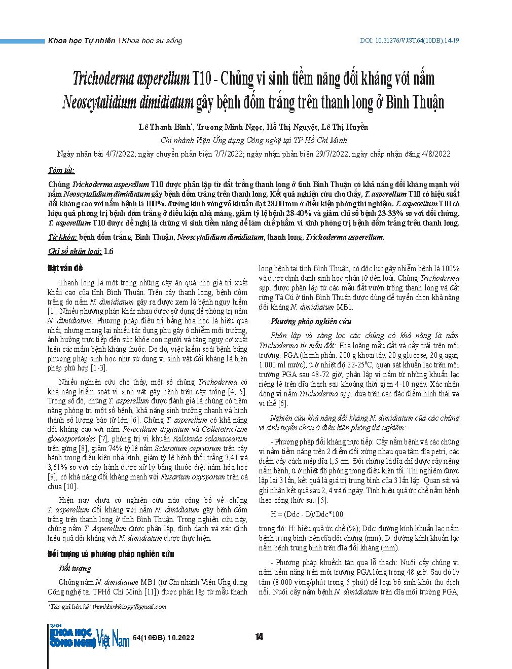 Trichoderma asperellum T10 - Chủng vi sinh tiềm năng đối kháng với nấm Neoscytalidium dimidiatum gây bệnh đốm trắng trên thanh long ở Bình Thuận = Trichoderma asperellum T10 - A potential microbial strain against the Neoscytalidium dimidiatum causes white