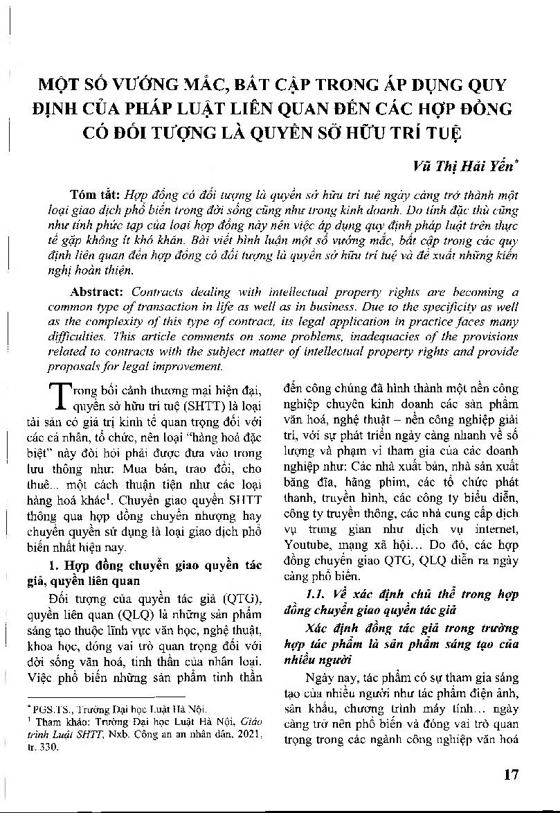 Một số vướng mắc, bất cập trong áp dụng quy định của pháp luật liên quan đến các hợp đồng có đối tượng là quyền sở hữu trí tuệ = Bottlenecks and Shortcomings in the Application of Laws Related to Contracts with the Subject Matter of Intellectual Property