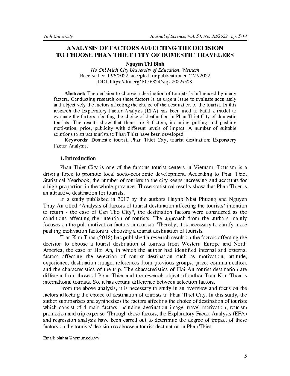 Phân tích các yếu tố ảnh hưởng đến việc lựa chọn điểm đến du lịch thành phố Phan Thiết của khách du lịch nội địa = Analysis of factors affecting the decision to choose Phan Thiet city of domestic travelers