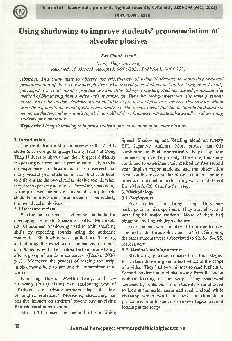 Sử dụng kỹ thuật tạo bóng để cải thiện khả năng phát âm âm phế nang của sinh viên = Using shadowing to improve students' pronounciation of alveolar plosive