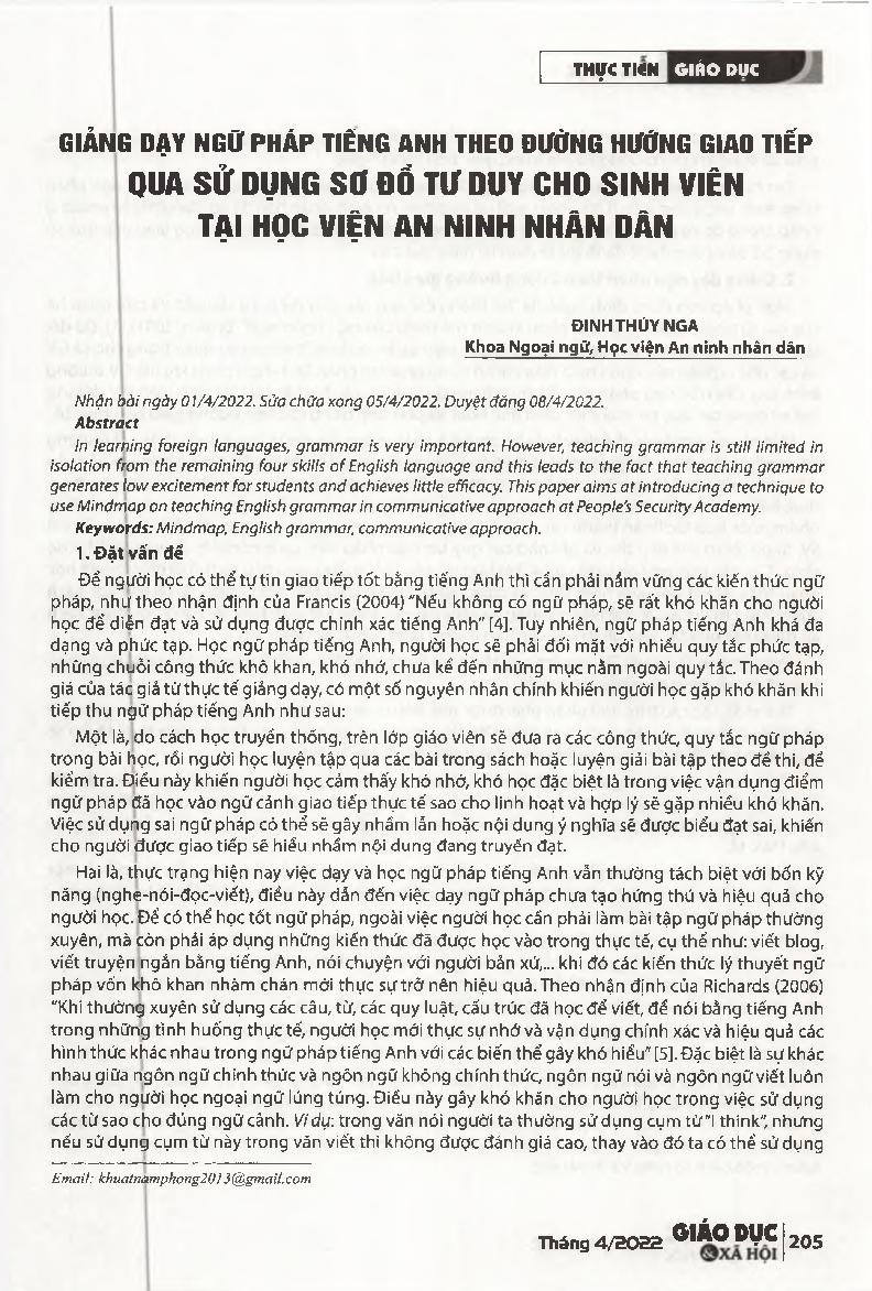 Giảng dạy ngữ pháp tiếng Anh theo đường hướng giao tiếp qua sử dụng sơ đồ tư duy cho sinh viên tại Học viện An ninh nhân dân = Teaching English grammar in communicative approach via using Mind-map for students at People&; 39;s Security Academy.