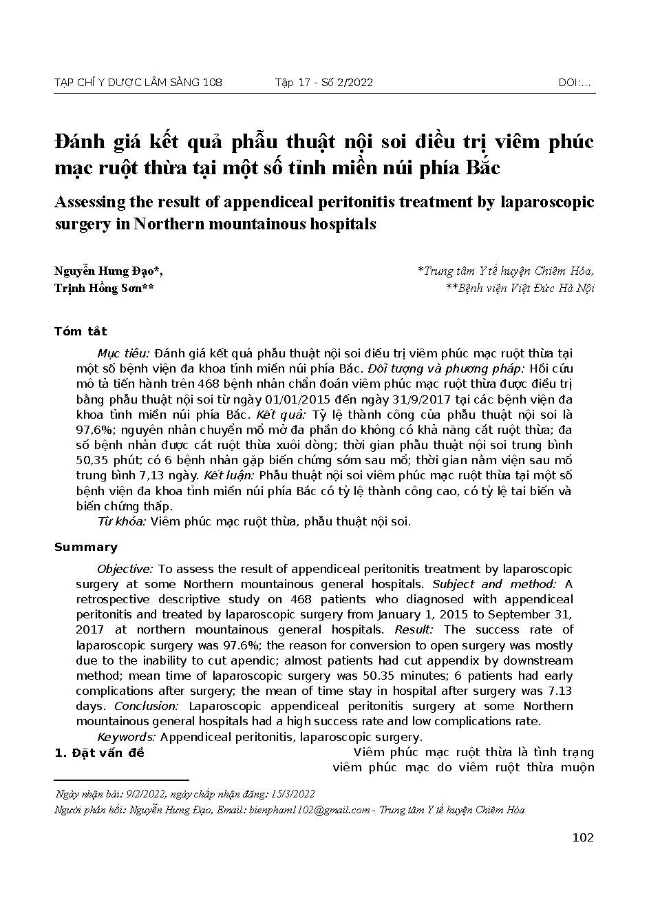 Đánh giá kết quả phẫu thuật nội soi điều trị viêm phúc mạc ruột thừa tại một số tỉnh miền núi phía Bắc = Assessing the result of appendiceal peritonitis treatment by laparoscopic surgery in Northern mountainous hospitals