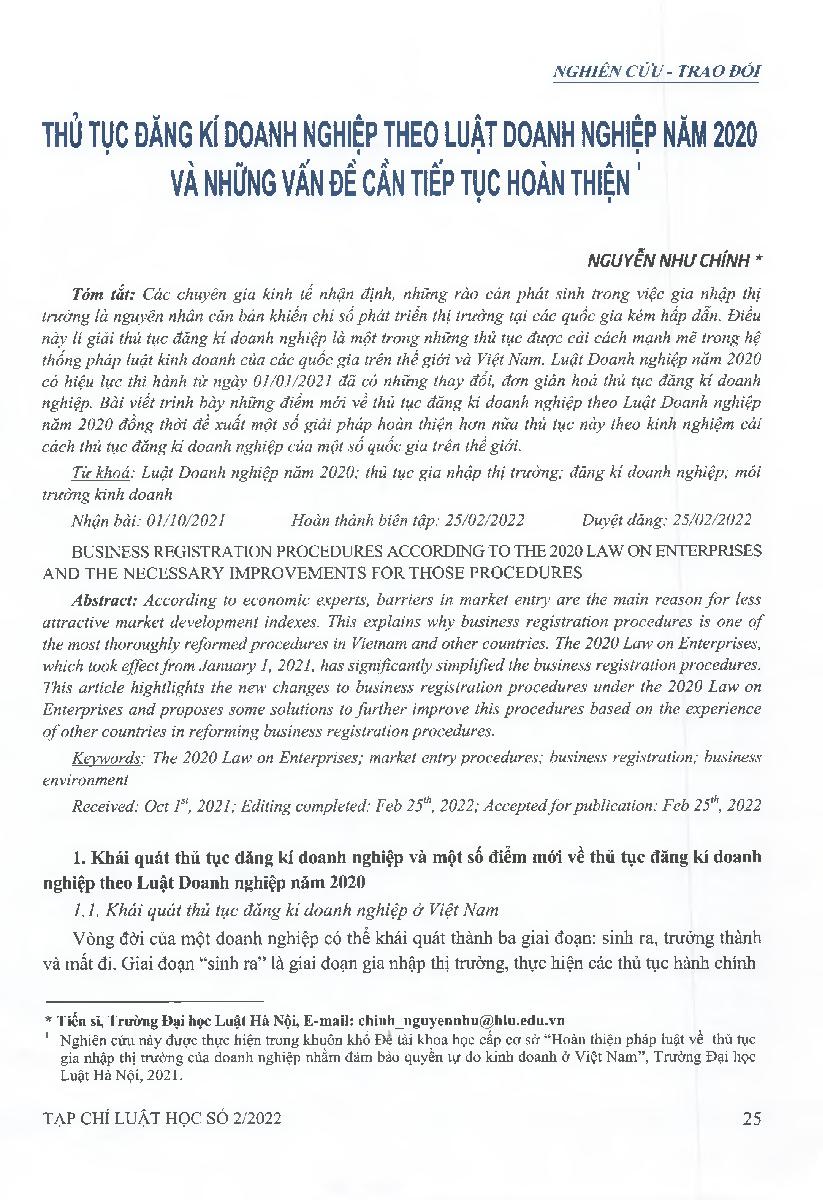 Thủ tục đăng kí doanh nghiệp theo Luật Doanh nghiệp năm 2020 và những vấn đề cần tiếp tục hoàn thiện = Business registration procedures according to the 2020 Law on Enterprises and the necessary improvements for those procedures
