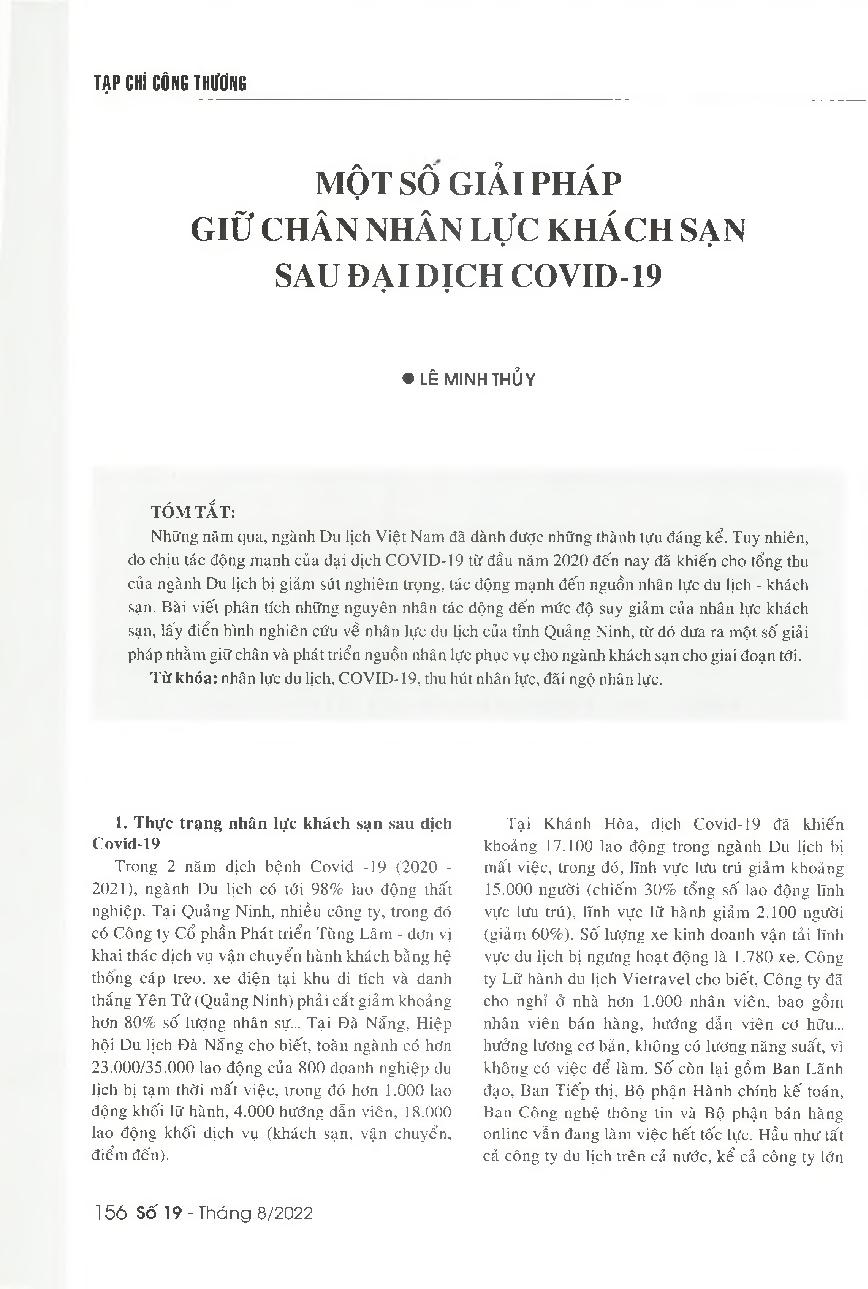 Một số giải pháp giữ chân nhân lực du lịch khách sạn sau đại dịch Covid-19 = Some solutions to retain the human resources for the hotel industry after the COVID-19 pandemic
