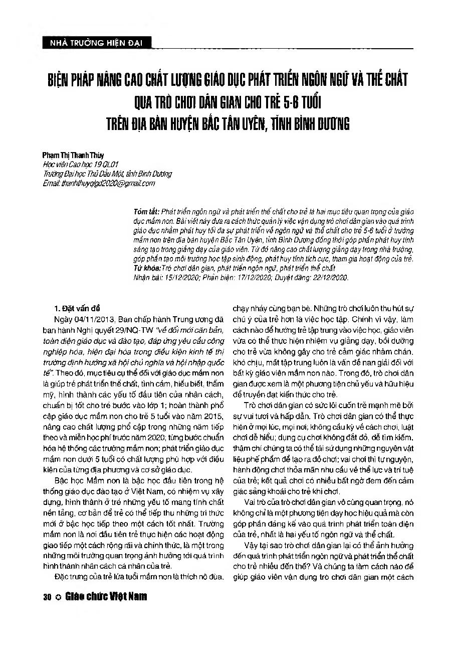 Biện pháp nâng cao chất lượng giáo dục phát triển ngôn ngữ và thể chất qua trò chơi dân gian cho trê 5-6 tuổi trên địa bàn huyện Bắc Tân Uyên, tỉnh Bình Dương = The measures to improve the quality of language and physical development education through folk games for the children aged 5-6 years old in Bac Tan Uyen district, Binh Duong province