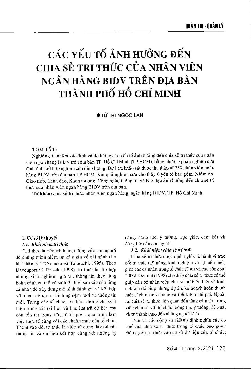 Các yếu tố ảnh hưởng đến chia sẻ tri thức của nhân viên Ngân hàng BIDV trên địa bàn thành phố Hồ Chí Minh = Factors affecting the knowledge sharing of the Joint stock Commercial Bank for Investment and Development of Vietnam (BIDV) - Ho Chi Minh City Branch's staff