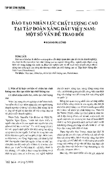 Đào tạo nhân lực chất lượng cao tại Tập đoàn Xăng dầu Việt Nam: một số vấn đề trao đồi = High-quality human resources training at Vietnam national petroleum group: Some discussions