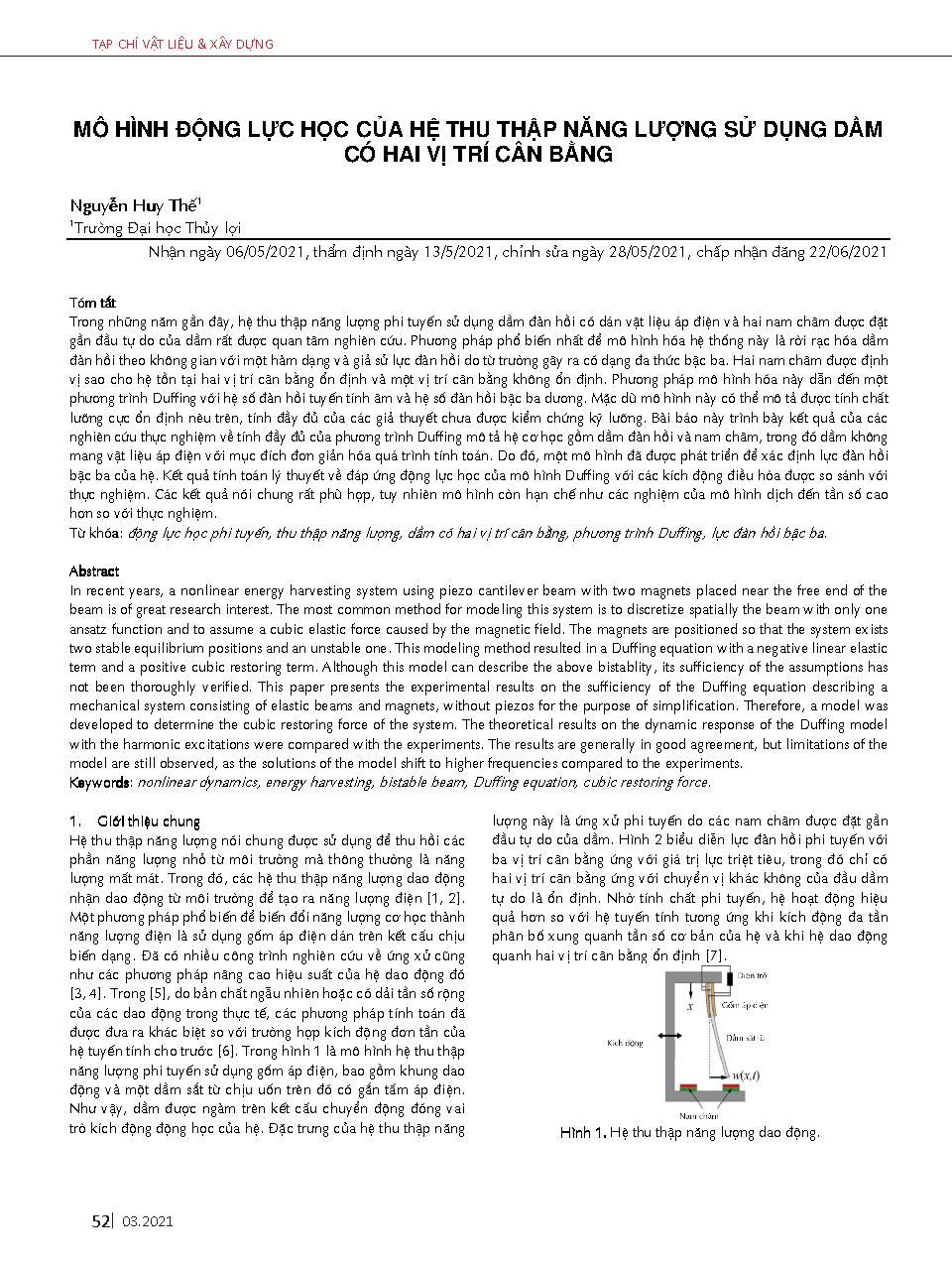 Mô hình động lực học của hệ thu thập năng lượng sử dụng dầm có hai vị trí cân bằng = Dynamic model of an energy-collecting system using beams with two equilibrium positions