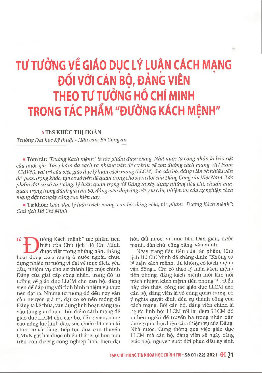 Tư tưởng về giáo dục lý luận cách mạng đối với cán bộ, đảng viên theo tư tưởng Hồ Chí Minh trong tác phẩm "đường kách mệnh"