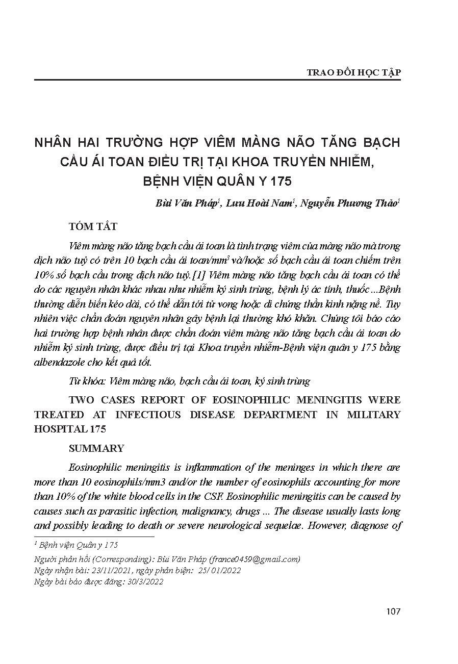 Nhân hai trường hợp viêm màng não tăng bạch cầu ái toan điều trị tại Khoa Truyền nhiễm, Bệnh viện Quân y 175 = Two cases report of eosinophilic meningitis were treated at infectious disease department in military hospital 175