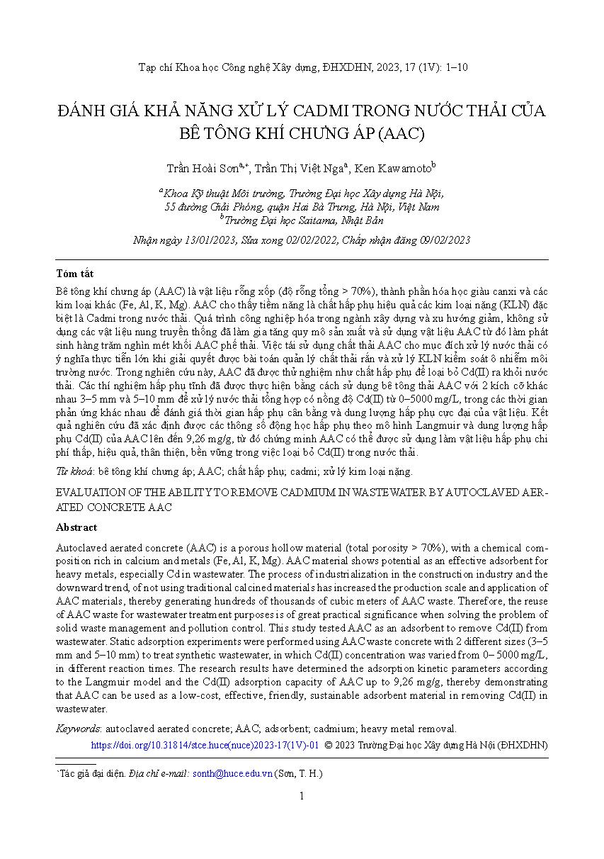 Đánh giá khả năng xử lý cadmi trong nước thải của bê tông khí chưng áp (AAC) = Evaluation of the ability to remove cadmium in wastewater by autoclaved aerated concrete AAC