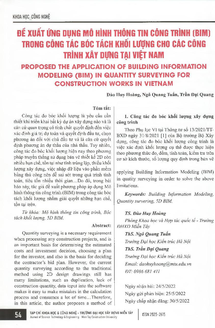Đề xuất ứng dụng mô hình thông tin công trình (BIM) trong công tác bóc tách khối lượng cho các công trình xây dựng tại Việt Nam = Proposed the application of building information modelling (BIM) in quantity surveying for construction works in Vietnam