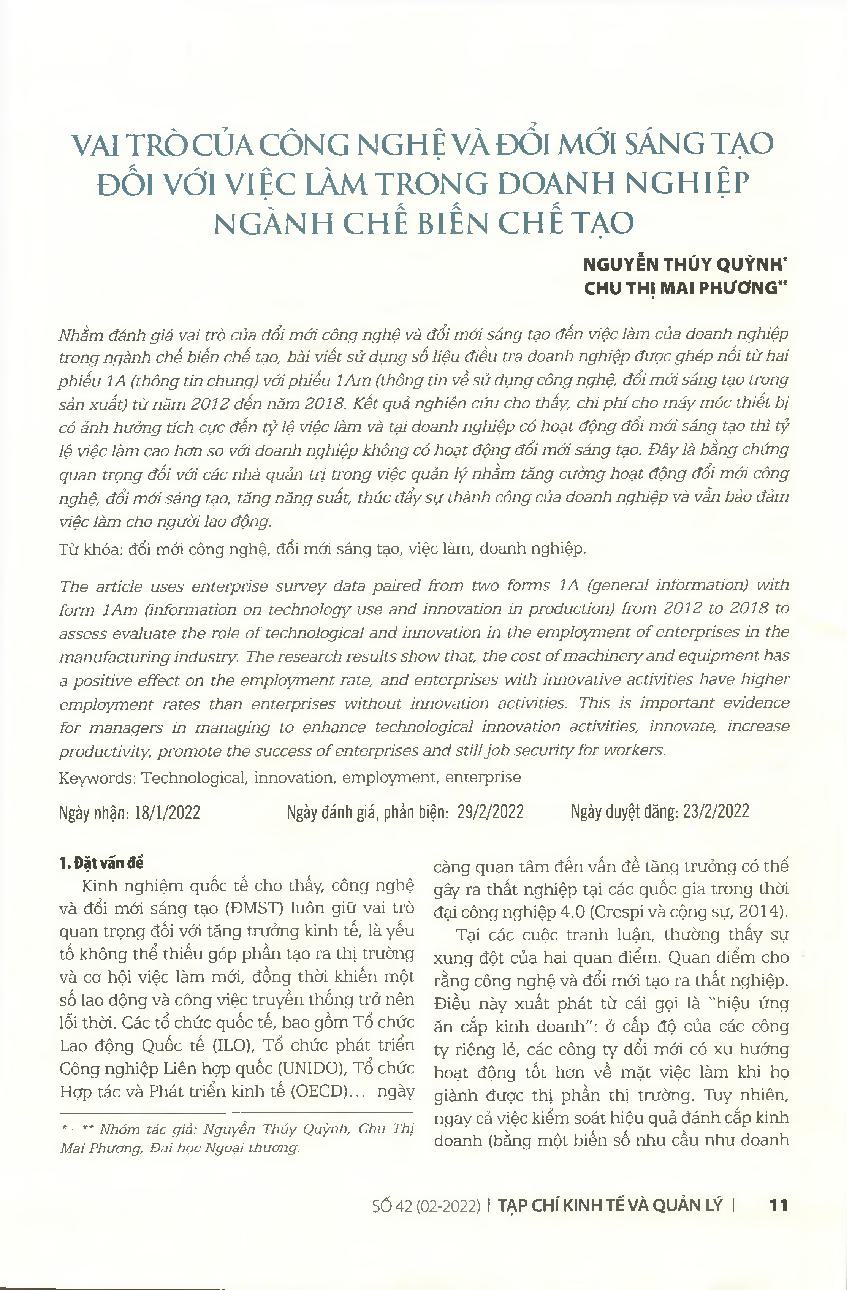 Vai trò của công nghệ và đổi mới sáng tạo đối với việc làm trong doanh nghiệp ngành chế biến chế tạo = The role of technology and innovation in employment in manufacturing enterprises in Vietnam
