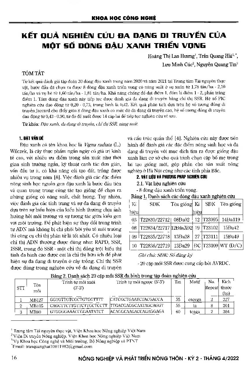 Kết quả nghiên cứu đa dạng di truyền của một số dòng đậu xanh triển vọng = Research on genetic diversity of prospective mung been germplasms