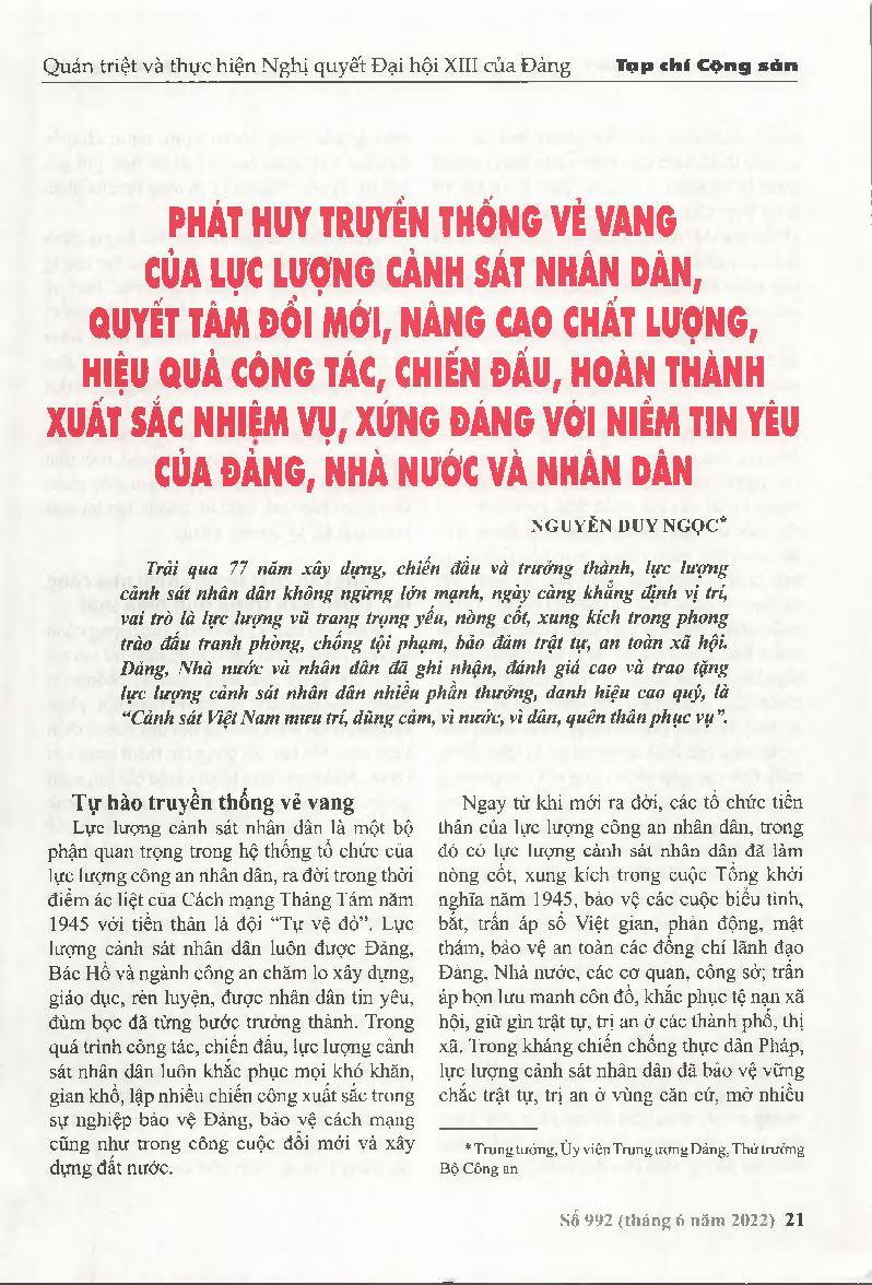 Phát huy truyền thống vẻ vang của lực lượng cảnh sát nhân dân, quyết tâm đổi mới, nâng cao chất lượng, hiệu quả công tác, chiến đấu, hoàn thành xuất sắc nhiệm vụ, xứng đáng với niềm tin yêu của Đảng, Nhà nước và nhân dân = Upholding the glorious tradition