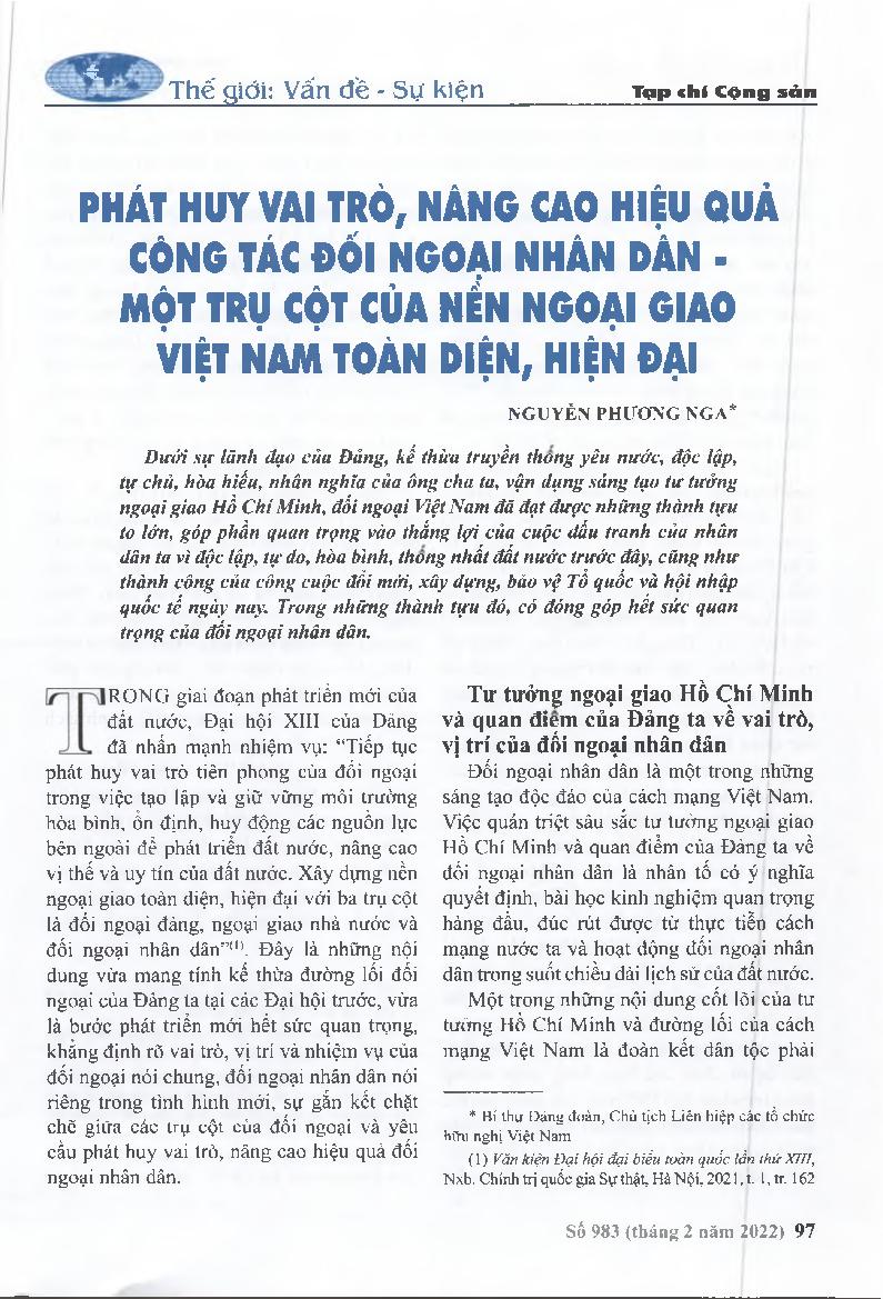 Phát huy vai trò, nâng cao hiệu quả công tác đối ngoại nhân dân - Một trụ cột của nền ngoại giao Việt Nam toàn diện, hiện đại = Promoting the role and improving the efficiency of people-to-people diplomacy - A pillar of a comprehensive and modern Vietname