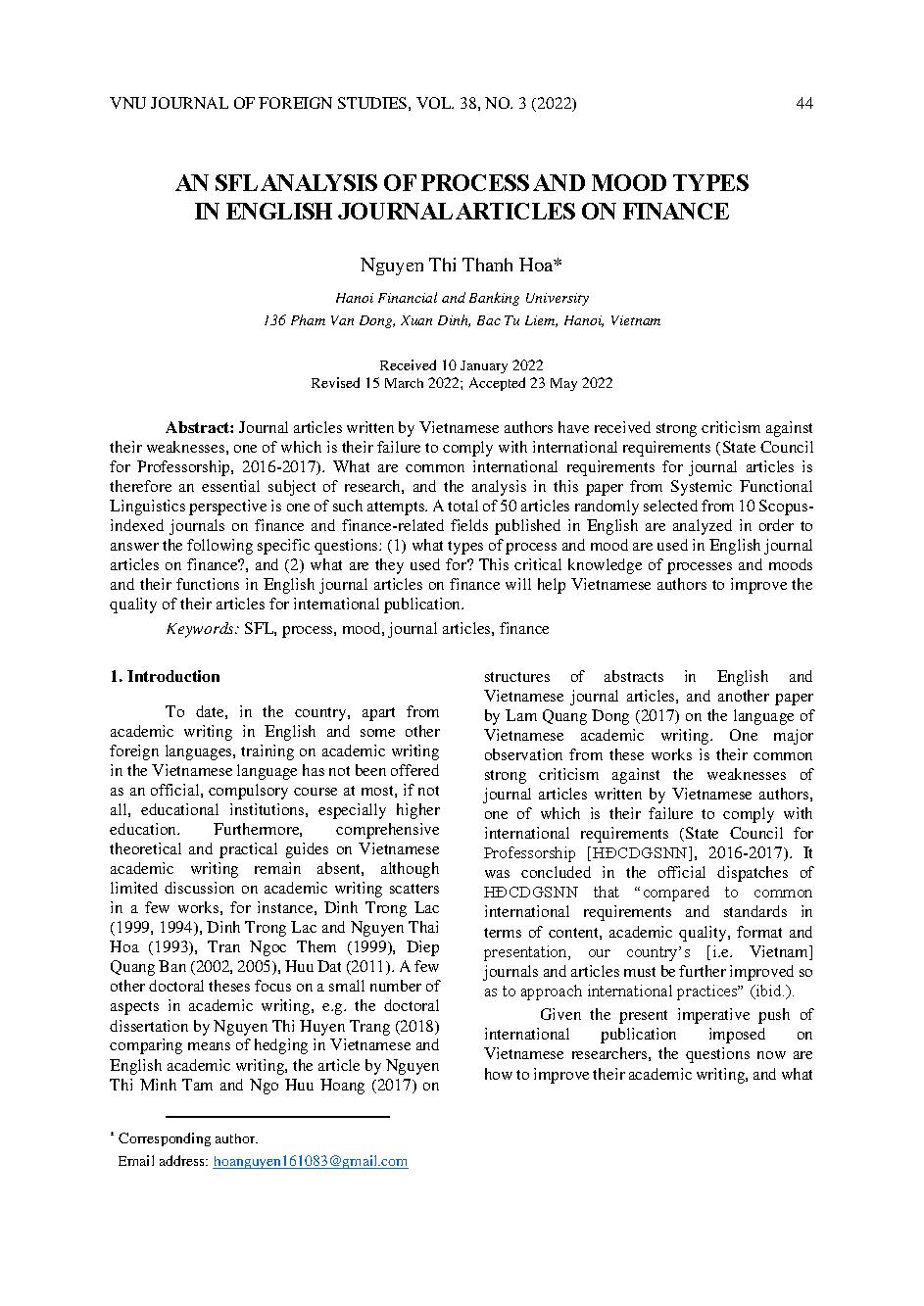 Các kiểu quá trình và thức trong bài báo chuyên ngành tài chính tiếng Anh dưới góc nhìn của ngôn ngữ học chức năng hệ thống = An SFL analysis of process and mood types in English journal articles on finance