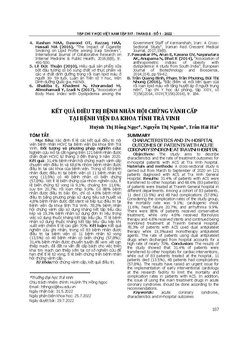 Kết quả điều trị bệnh nhân hội chứng vành cấp tại Bệnh viện Đa khoa tỉnh Trà Vinh = Characteristics and in-hospital outcomes of patients with acute coronary syndrome at Tra Vinh hospital