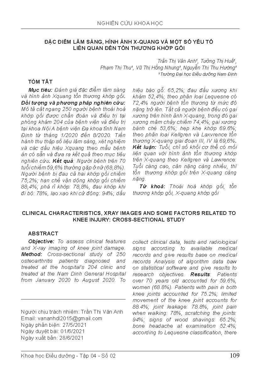 Đặc điểm lâm sàng, hình ảnh x-quang và một số yếu tố liên quan đến tổn thương khớp gối = Clinical characteristics, xray images and some factors related to knee injury: cross-sectional study