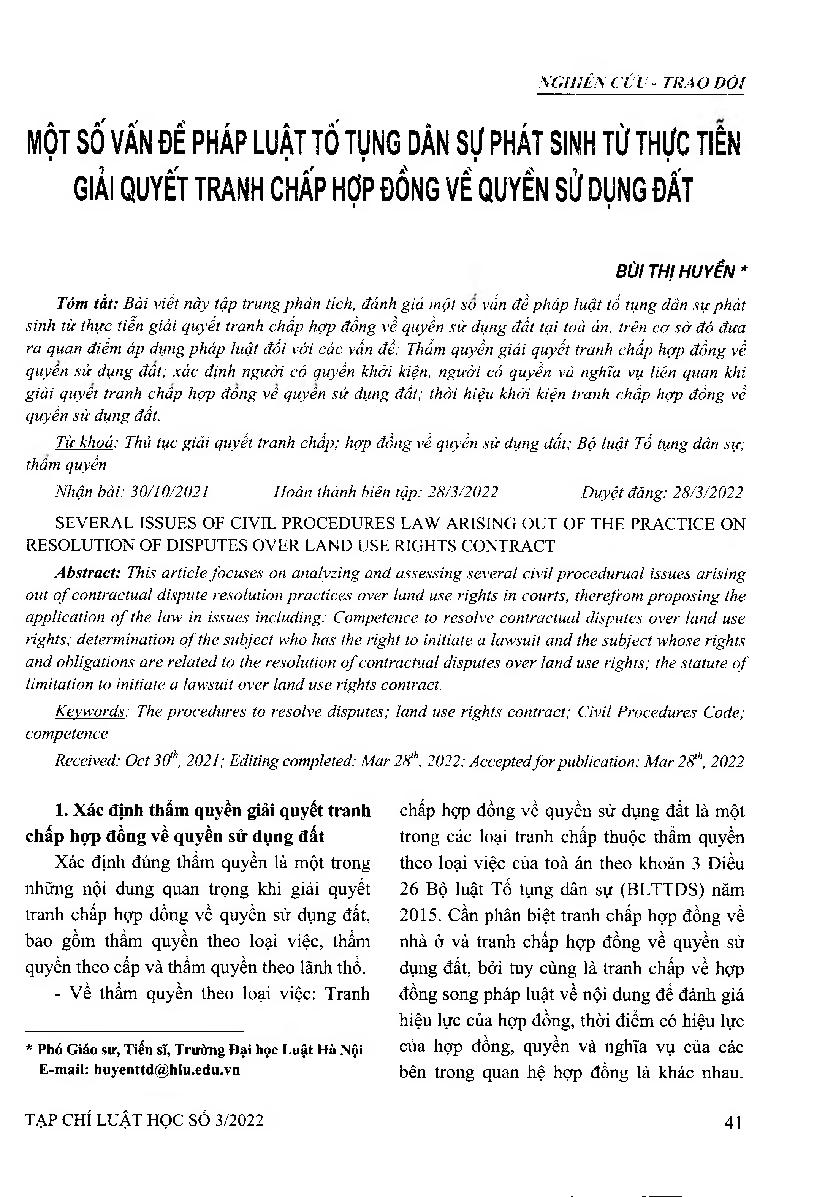 Một số vấn đề pháp luật tố tụng dân sự phát sinh từ thực tiễn giải quyết tranh chấp hợp đồng về quyền sử dụng đất = Several issues of civil procedures law arising out of the practice on resolution of disputes over land use rights contract