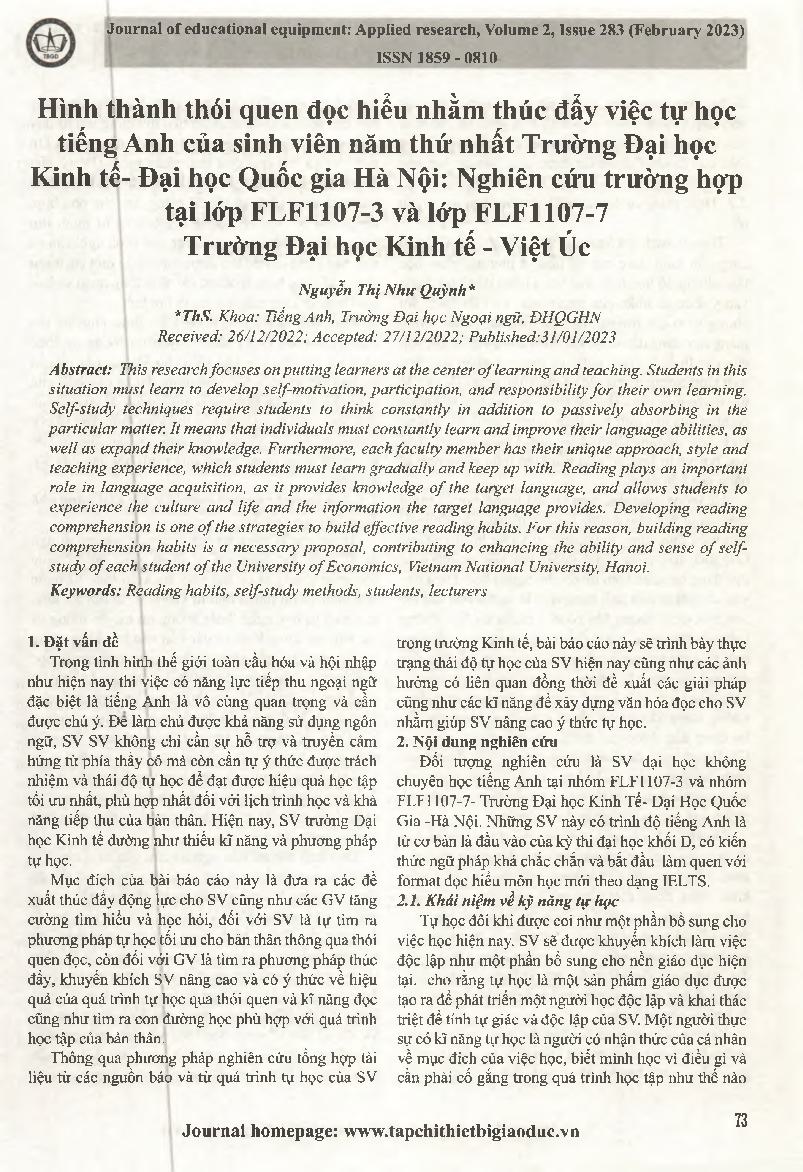 Hình thành thói quen đọc hiểu nhằm thúc đẩy việc tự học tiếng Anh của sinh viên năm thứ nhất Trường Đại học Kinh tế- Đại học Quốc gia Hà Nội: Nghiên cứu trường hợp tại lớp FLF1107-3 và lớp FLF1107-7 Trường Đại học Kinh tế - Việt Úc = Forming reading compr