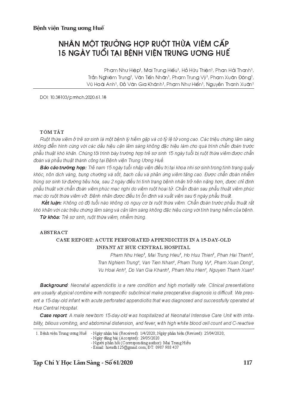 Nhân một trường hợp ruột thừa viêm cấp 15 ngày tuổi tại Bệnh viện Trung ương Huế = Case report: Acute perforated appendicitis in a 15-day-old infant at Hue central hospital