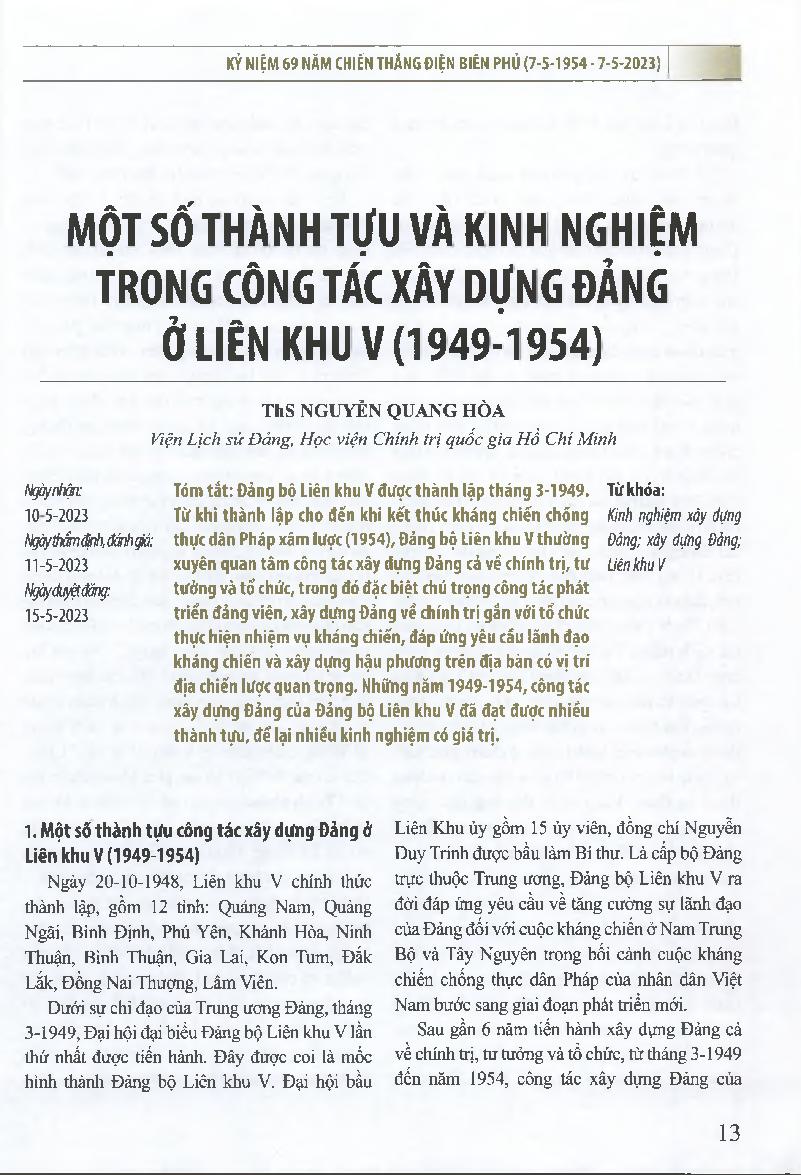 Một số thành tựu và kinh nghiệm trong công tác xây dựng Đảng ở liên khu V (1949-1954)