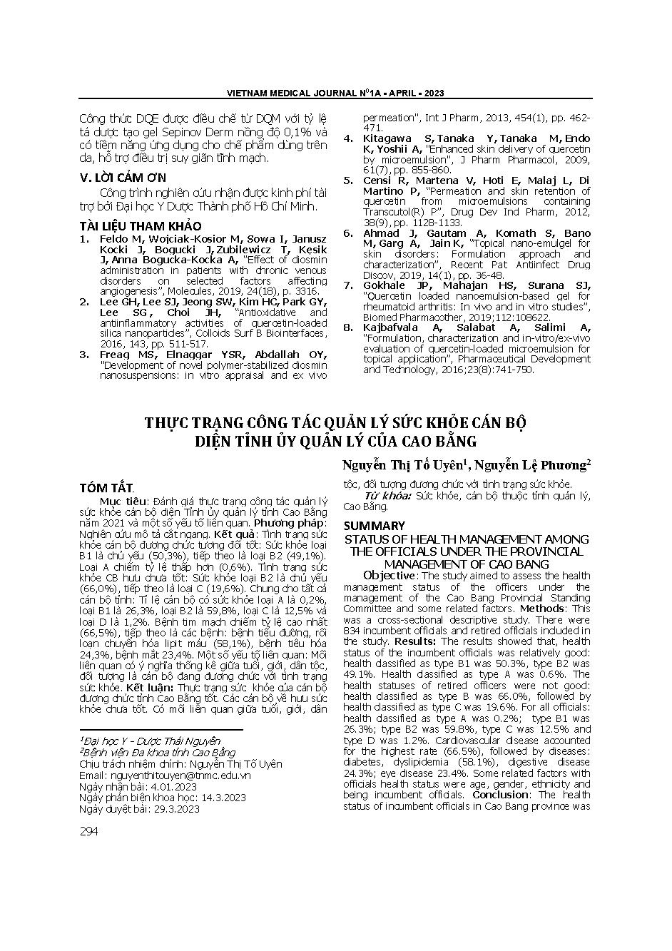 Thực trạng công tác quản lý sức khỏe cán bộ diện tỉnh ủy quản lý của Cao Bằng = Status of health management among the officials under the provincial management of Cao Bang