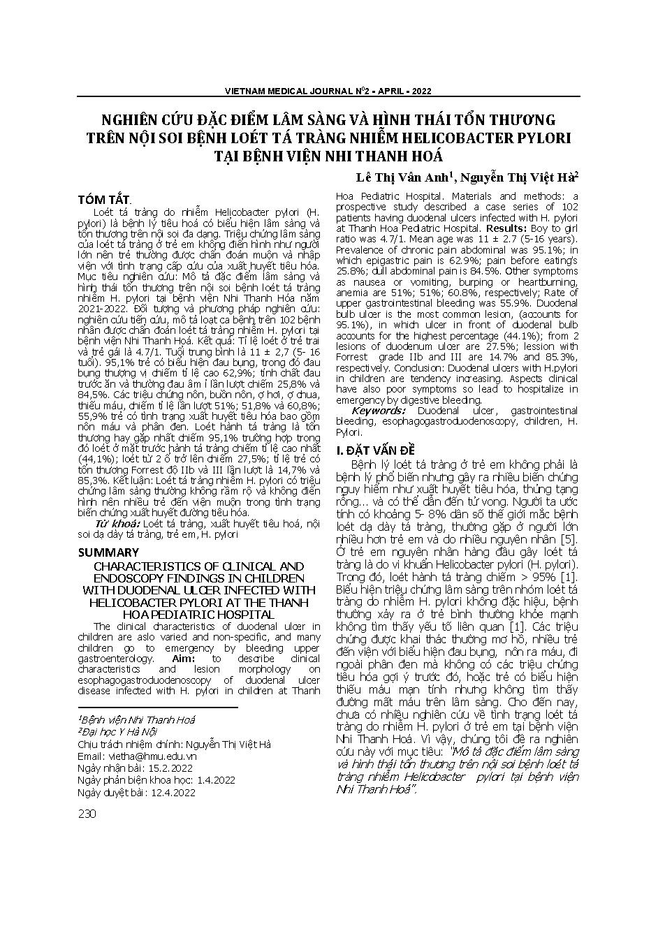 Nghiên cứu đặc điểm lâm sàng và hình thái tổn thương trên nội soi bệnh loét tá tràng nhiễm helicobacter pylori tại Bệnh viện Nhi Thanh Hoá = Characteristics of clinical and endoscopy findings in children with duodenal ulcer infected with helicobacter pylo