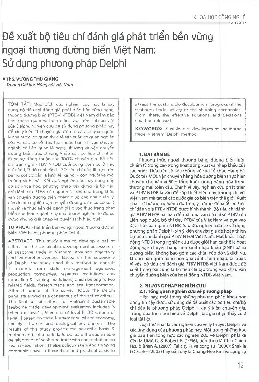 Đế xuất bộ tiêu chí đánh giá phát triển bền vững ngoại thương đường biển Việt Nam: Sử dụng phương pháp Delphi = Proposing a set of criteria to evaluate the sustainable development of Vietnam&; 39;s seaborne foreign trade using the Delphi method