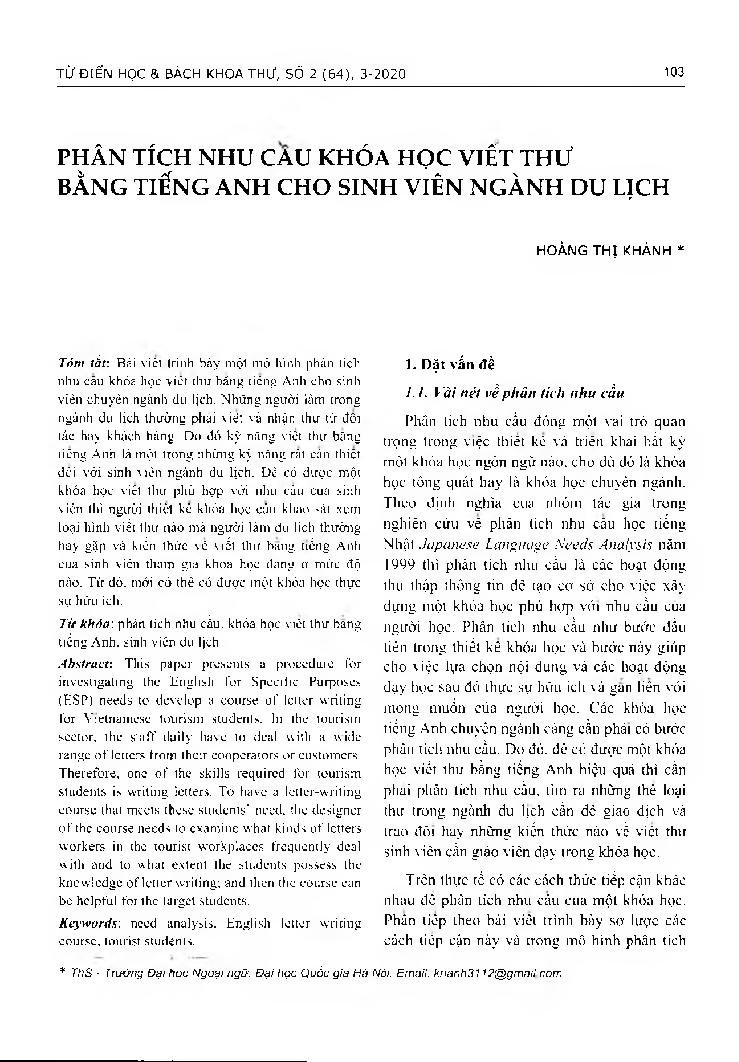 Phân tích nhu cầu khóa học viết thư bằng tiếng Anh cho sinh viên ngành du lịch = A need analysis survey: English letter writing course for tourist students