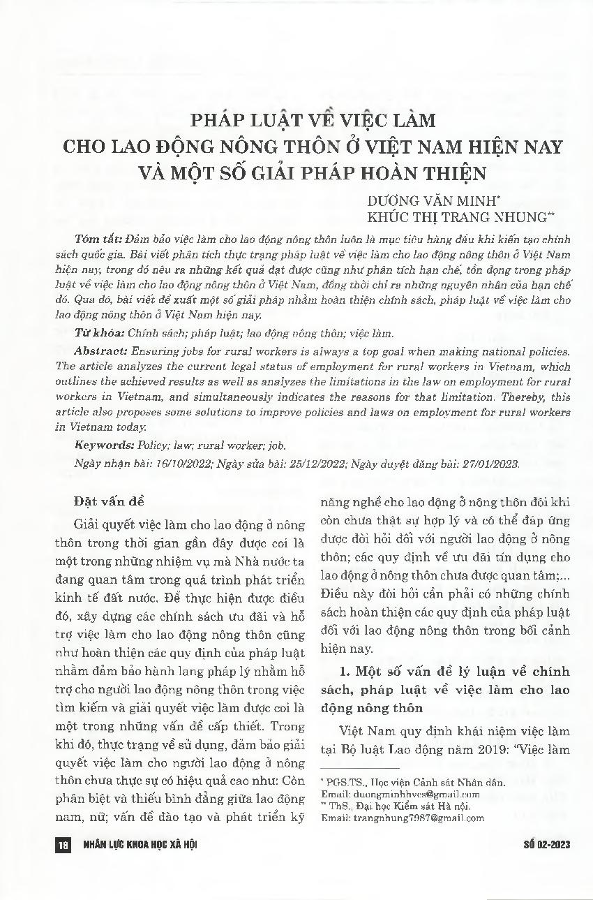 Pháp luật về việc làm cho lao động nông thôn ở Việt Nam hiện nay và một số giải pháp hoàn thiện = Current law on employment for rural workers in Vietnam and some solutions