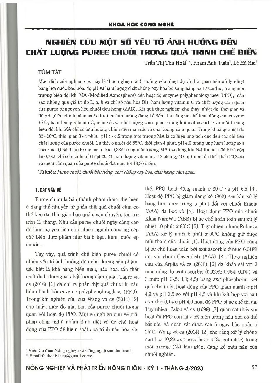 Nghiên cứu một số yếu tố ảnh hưởng đến chất lượng puree chuối trong quá trình chế biến = Research on some factors affecting the quality of banana puree in the processing