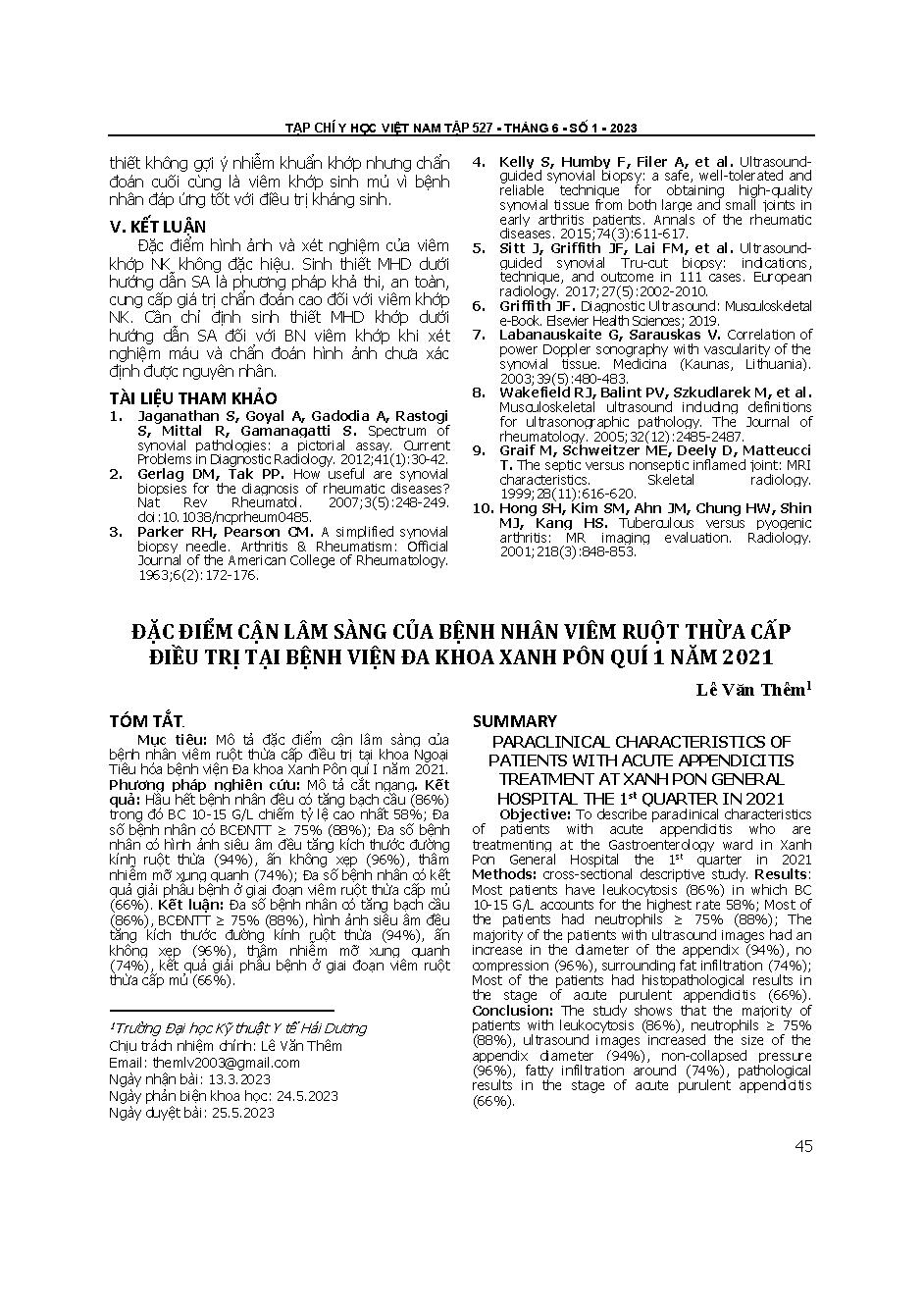 Đặc điểm cận lâm sàng của bệnh nhân viêm ruột thừa cấp điều trị tại Bệnh viện Đa khoa Xanh Pôn quý 1 năm 2021 = Paraclinical characteristics of patients with acute appendicitis treatment at Saint Paul general hospital the 1st quarter in 2021