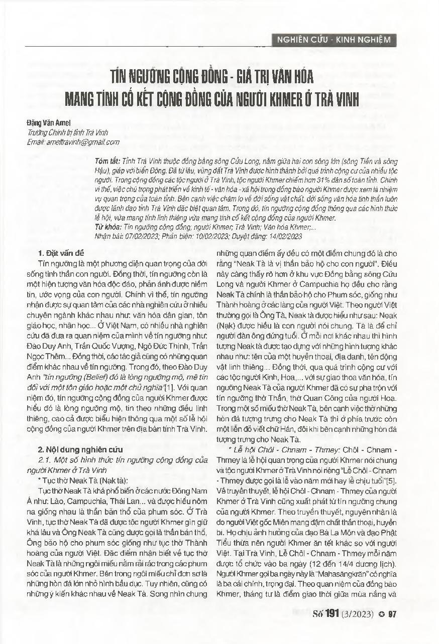Tín ngưỡng cộng đồng - Giá trị văn hóa mang tính cố kết cộng đồng của người Khmer ở Trà Vinh = Community beliefs - The coherent cultural values of the Khmer community in Tra Vinh