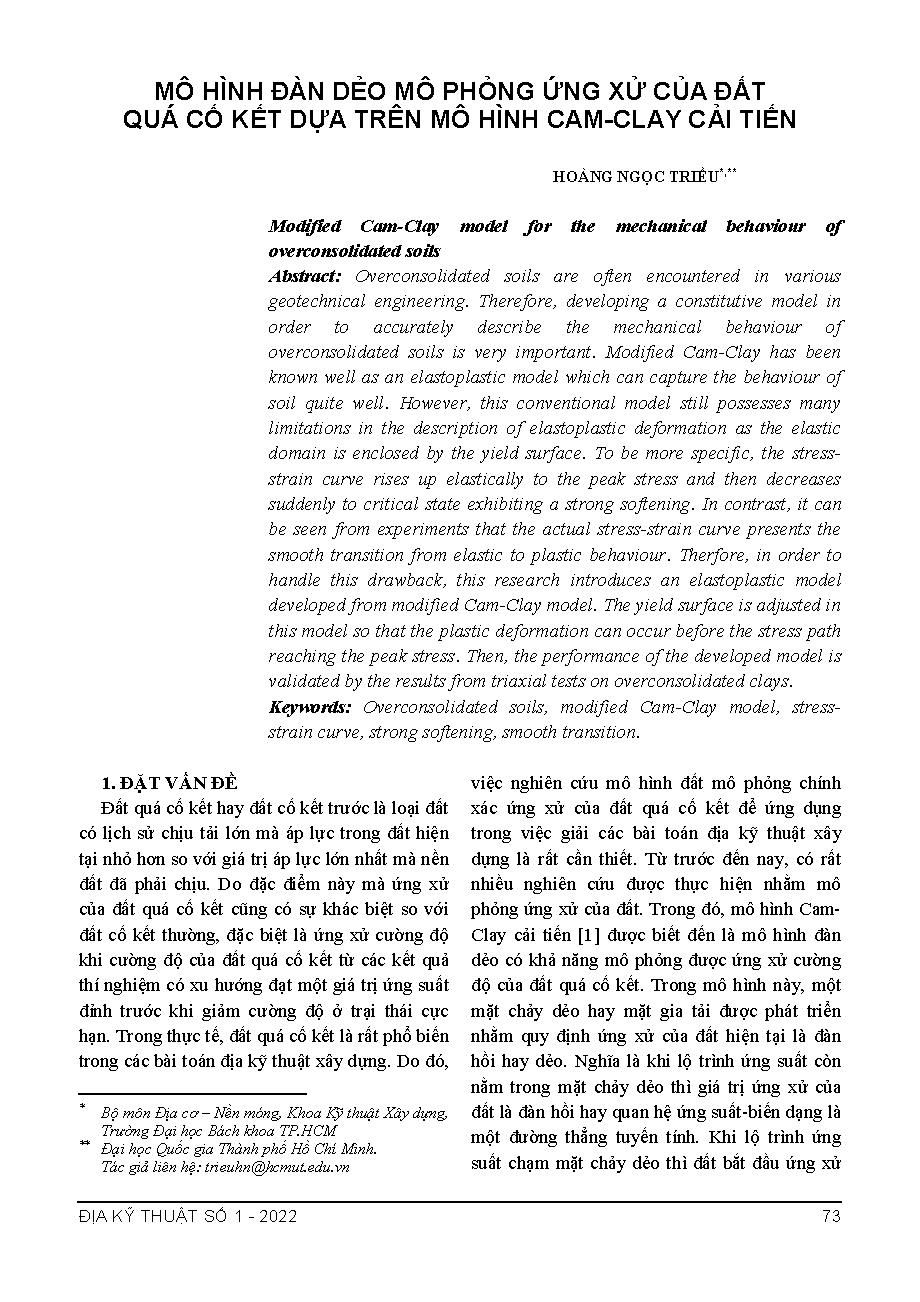 Mô hình đàn dẻo mô phỏng ứng xử của đất quá cố kết dựa trên mô hình Cam-Clay cải tiến = Modified Cam-Clay model for the mechanical behaviour of overconsolidated soils