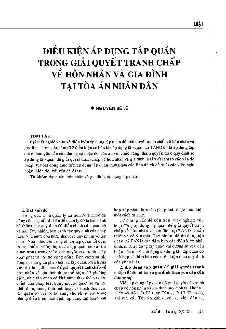 Điều kiện áp dụng tập quán trong giải quyết tranh chấp về hôn nhân và gia đình tại tòa án nhân dân = Conditions for applying customs to resolve marriage and family disputes at the People's Court