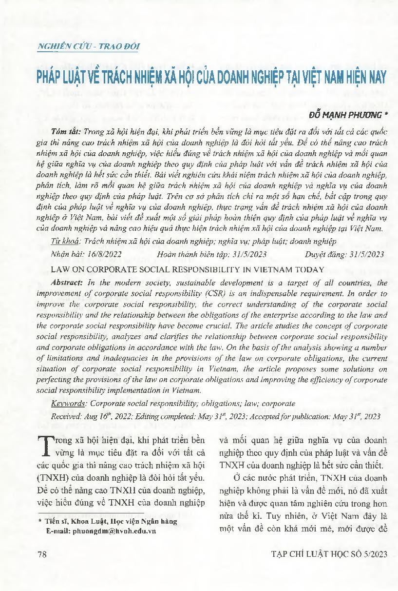 Pháp luật về trách nhiệm xã hội của doanh nghiệp tại Việt Nam hiện nay = Law on corporate social responsibility in Vietnam today