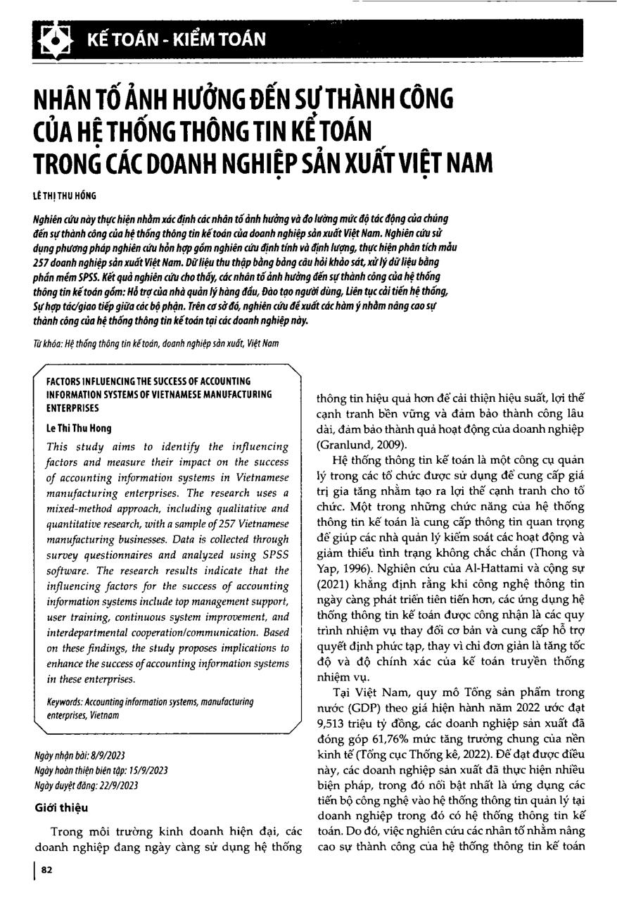 Nhân tố ảnh hưởng đến sự thành công của hệ thống thông tin kế toán trong các doanh nghiệp sản xuất Việt Nam