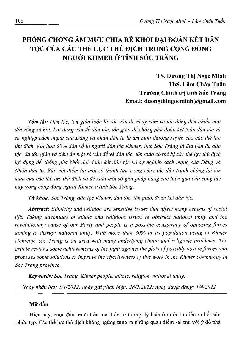 Phòng chống âm mưu chia rẽ khối đại đoàn kết dân tộc của các thế lực thù địch trong cộng đồng người Khmer ở tỉnh Sóc Trăng = Preventing the plot to divide the great national unity bloc of hostile forces in the Khmer community in Soc Trang province