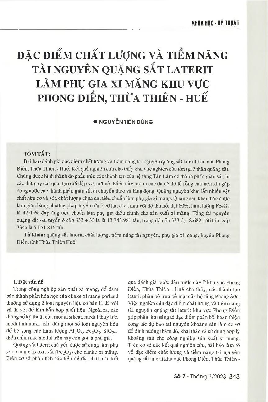 Đặc điểm chất lượng và tiềm năng tài nguyên quặng sắt laterit làm phụ gia xi măng khu vực Phong Điền, Thừa Thiên Huế = Quality characteristics and resource potential of lateritic iron ore as additive for cement production in Phong Dien area, Thua Thien -