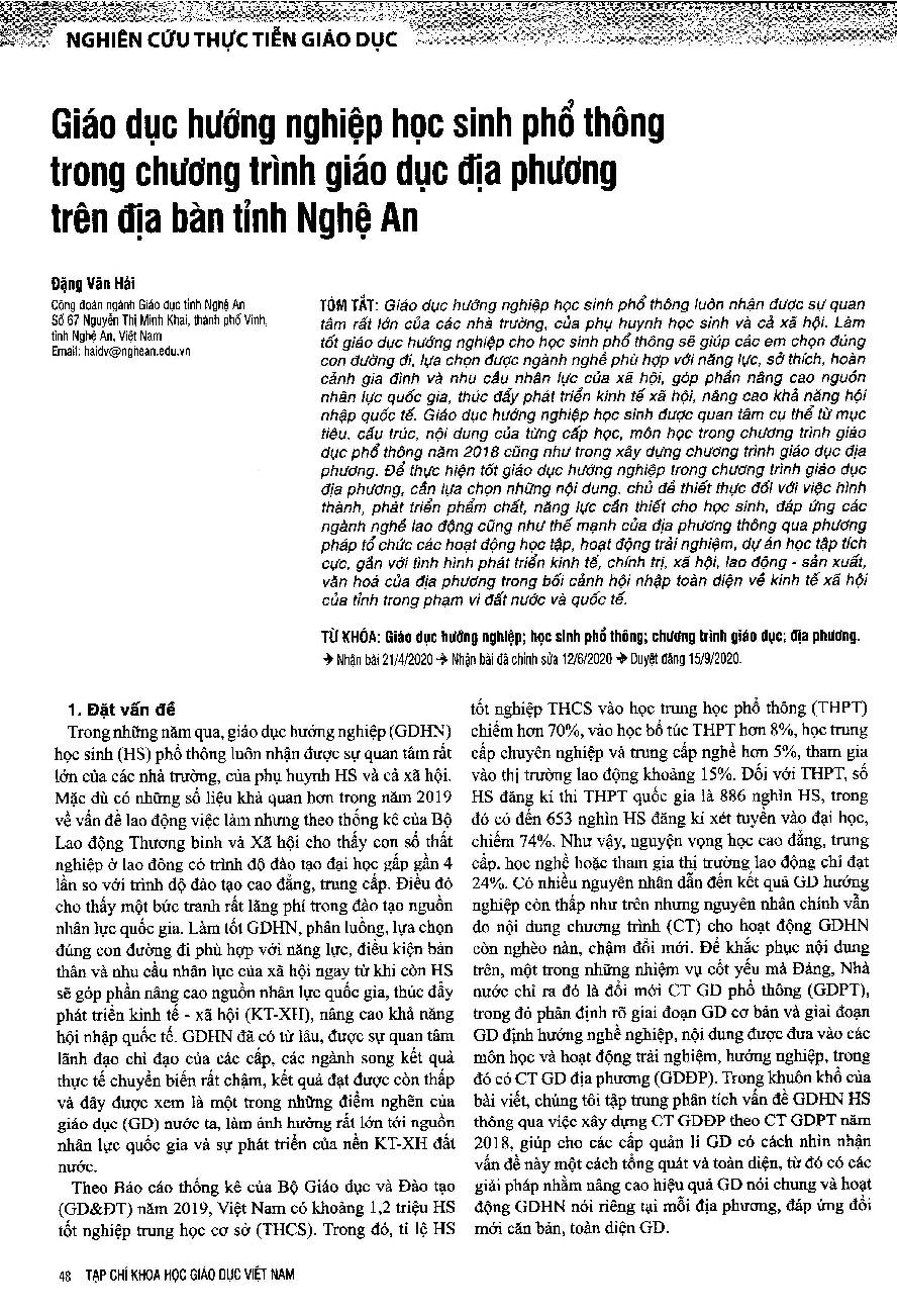 Giáo dục hướng nghiệp học sinh phổ thông trong chương trình giáo dục địa phương trên địa bàn tỉnh Nghệ An = Vocational education for high school students under the education program in nghe an province