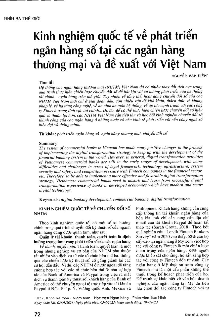 Kinh nghiệm quốc tế về phát triển ngàn hàng số tại các ngân hàng thương mại và đề xuất với Việt Nam