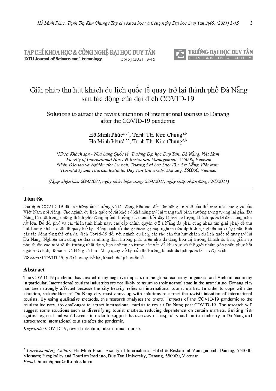 Giải pháp thu hút khách du lịch quốc tế quay trở lại thành phố Đà Nẵng sau tác động của đại dịch COVID-19 = Solutions to attract the revisit intention of international tourists to Danang after the COVID-19 pandemic