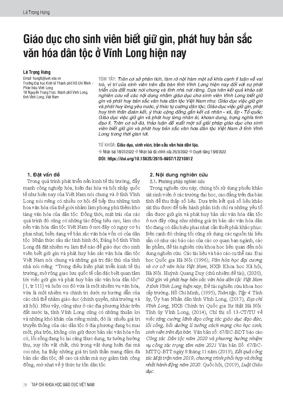 Giáo dục cho sinh viên biết giữ gìn, phát huy bản sắc văn hóa dân tộc ở Vĩnh Long hiện nay = Education for students to preserve and promote the national cultural identity in vinh long today
