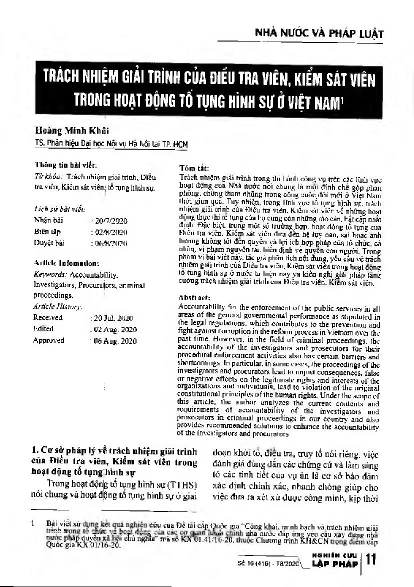 Trách nhiệm giải trình của điều tra viên, kiểm sát viên trong hoạt động tổ tụng hình sự ở Việt Nam = Accountability of Investigators and Procurators in Criminal Proceedings in Vietnam